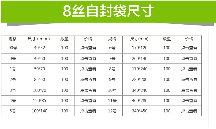 紅色外包裝)厚度為單面4絲 雙面8絲 每包數(shù)量100個(gè) 可能會發(fā)生正負(fù)差(0-4號可能差別大一點(diǎn) 5-12號差別很小 5號以上差別幾率很小)